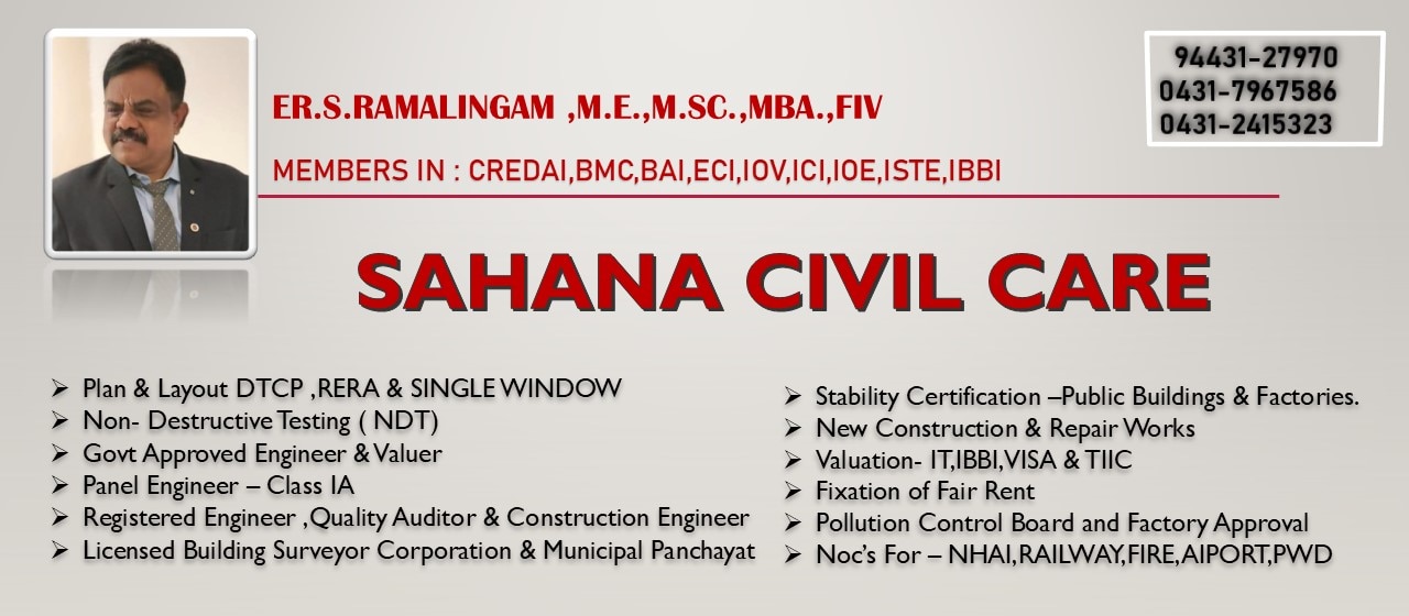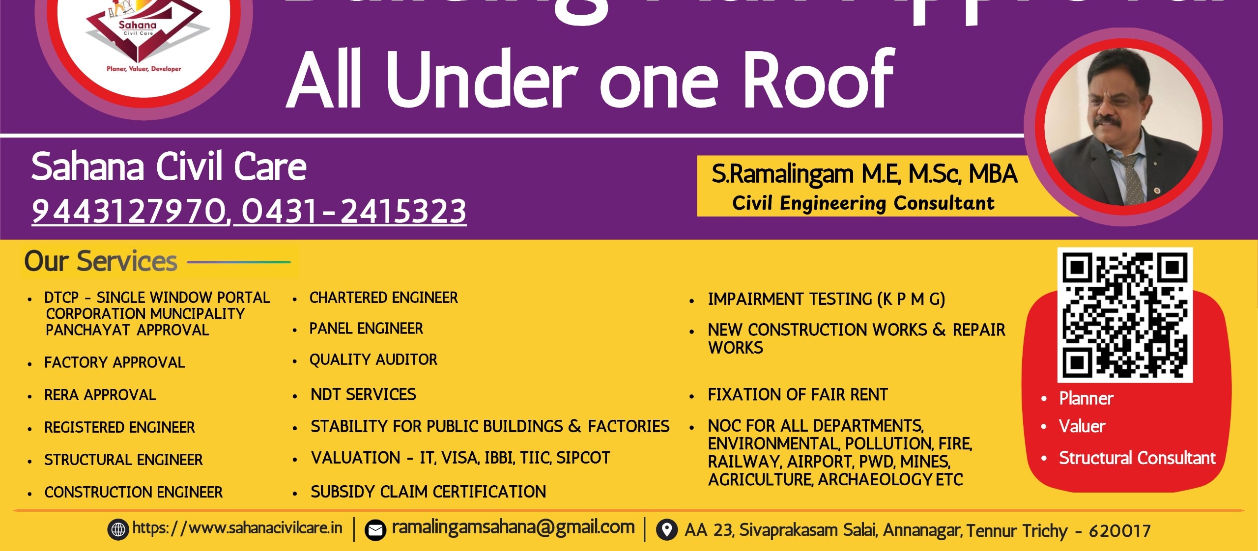 Sahana Civil Care in Trichy provides all the necessary resources required for construction purposes, covering a wide spectrum of sectors that consist of building, layout plans, valuation, painting, renovation etc. We are a 360° c...Read More